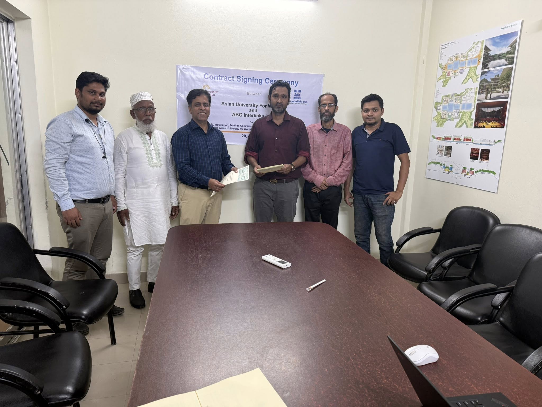 The signing ceremony was attended by Mr. Tanvir Islam, representing Asian University for Women. From ABG Interlinks Ltd., Mr. S. M. Gofranul Hoque, Mr. Najmol Sakin Pranta, and Mr. Enamul Hoque were present to mark the occasion.